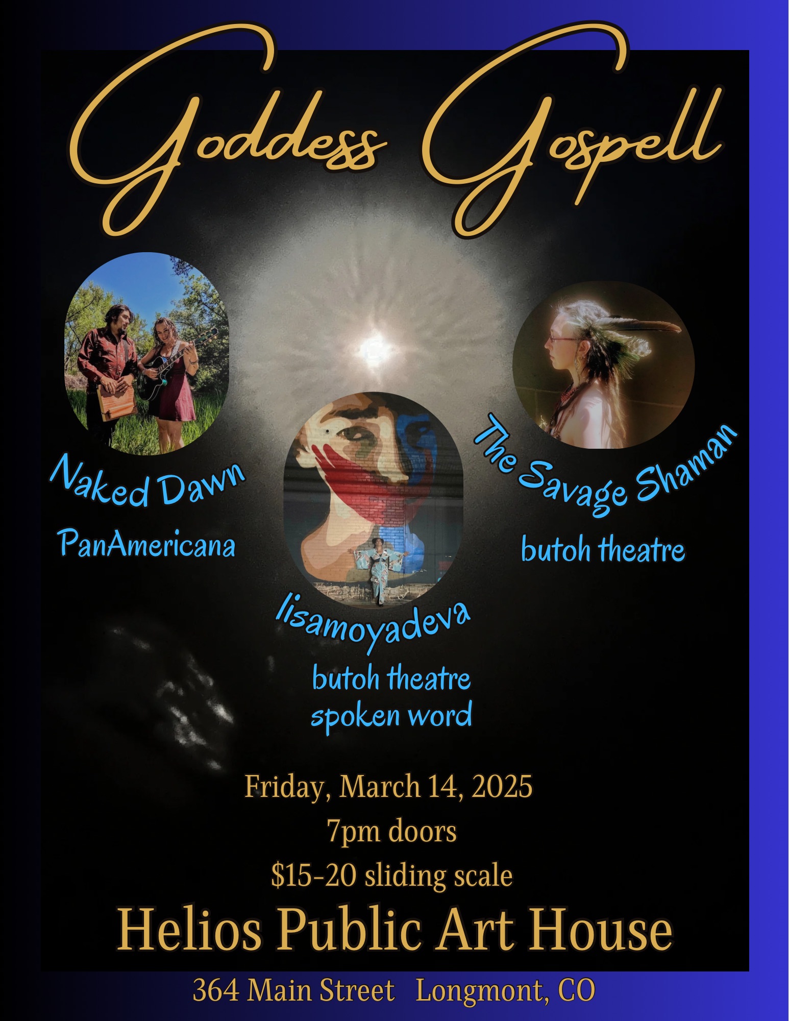 You are cordially invited to join me for my first Butoh performance since 2010 (omg…even writing that is wild, has it really been 15 years?!?) at Helios Public Art House in Longmont THIS FRIDAY March 14! Support avant garde and grassroots protest art and come to this interactive, multi-media performance with live music, ritual, prayer, poetry, video and Butoh theater!